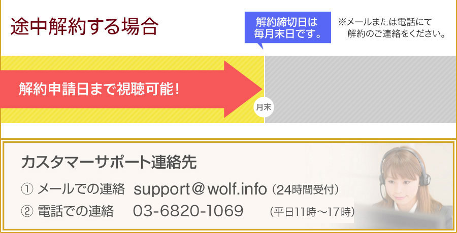 解約について | ※いつでも途中解約ができます。その際はメールか電話でご連絡ください 解約のご連絡がなければ、毎月月末に自動で課金されます。 ※解約のご連絡は毎月、末日までにお願いいたします。ご連絡いただけない場合は翌月分が課金されます。 |